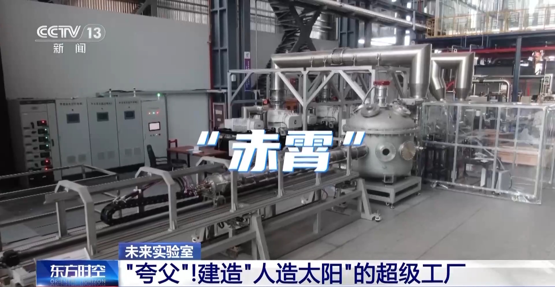 这是强流直线等离子体装置“赤霄”,每平方米每秒钟可极速喷射出10的24次方——即亿亿亿个粒子,一次可连续运行24小时以上,对新研制的“人造太阳”壁材料进行充分检测。